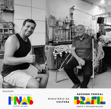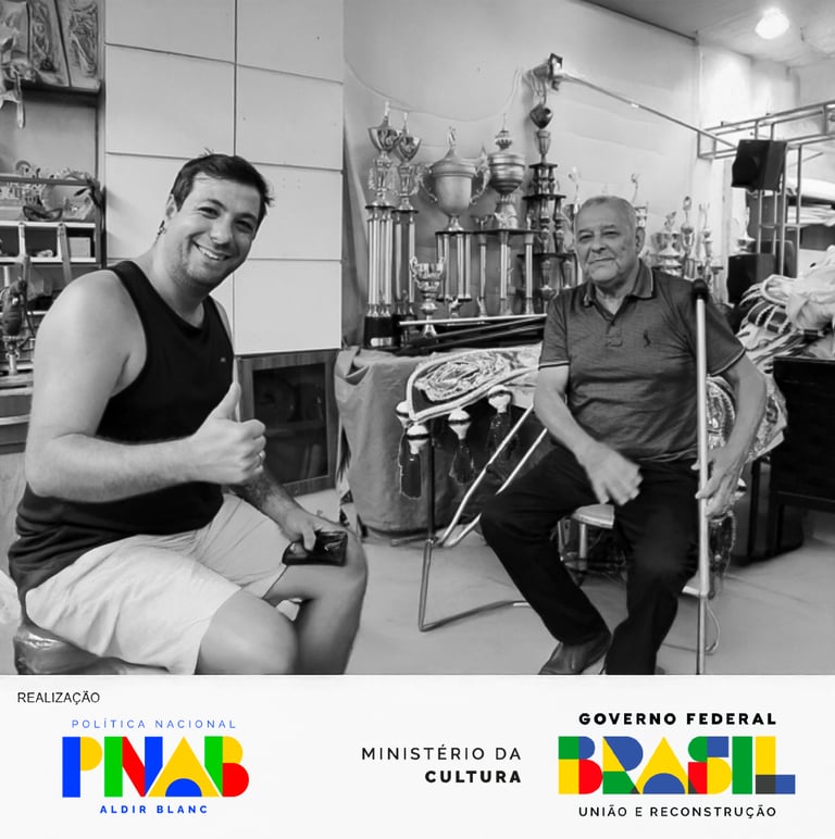 Imagem em preto e branco tirada durante uma entrevista no barracão da escola de samba de Pinhais. À esquerda, está um homem jovem de bermuda clara e regata escura, sentado e sorrindo, com o polegar levantado em sinal de aprovação. À direita, um homem mais velho está sentado com apoio de bengala, olhando para a câmera com expressão serena. Ao fundo, há diversos troféus grandes e fantasias de carnaval armazenadas, evidenciando o contexto de uma trajetória cultural premiada. Na parte inferior da imagem, estão os logotipos da Política Nacional Aldir Blanc, Ministério da Cultura e Governo Federal.Escreva seu texto aqui...