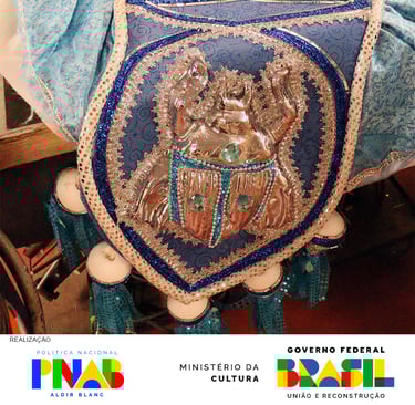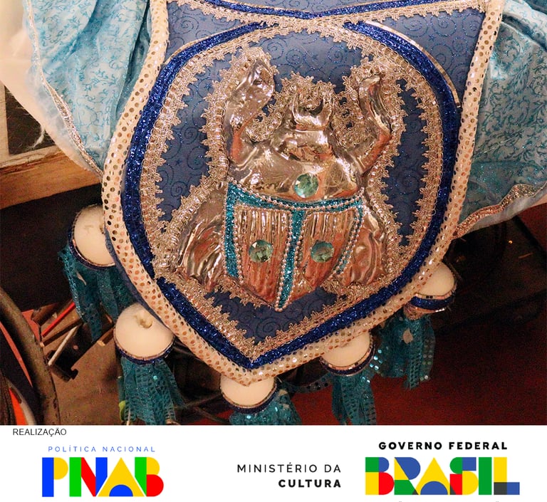 Imagem colorida em plano fechado mostrando um detalhe de fantasia de carnaval usada por escola de samba de Pinhais. O destaque é um escudo bordado em tons de azul, prata e dourado, com aplicação de pedrarias verdes e brilho metálico. Ao redor do escudo, franjas decorativas e pequenos discos pendem como adorno, reforçando o estilo luxuoso da peça. O tecido de fundo é azul claro com arabescos e acabamento de paetês. Na parte inferior da imagem, estão os logotipos da Política Nacional Aldir Blanc, Ministério da Cultura e Governo Federal.