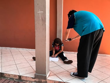 Filmagem: Com roteiro em mãos e noções de enquadramento assimiladas, hora de filmar! Muitos alunos nunca tinham segurado uma câmera de forma consciente antes, então começamos pelo básico: postura ao filmar, como evitar imagens tremidas e noções de movimento de câmera (panorâmicas, zoom, etc.). Aqui os smartphones entraram em cena: mostrei que, com planejamento e técnica, o celular de cada um pode se tornar uma ferramenta poderosa de filmagem. Divididos em equipes, eles se revezaram nos papéis de diretor, cinegrafista e até atores, gravando pequenas cenas baseadas nos roteiros que criaram. A escola virou nosso set de filmagem por um dia, com direito a muita risada nas tentativas e erros, mas também àquela concentração boa quando todos queriam "a cena perfeita".