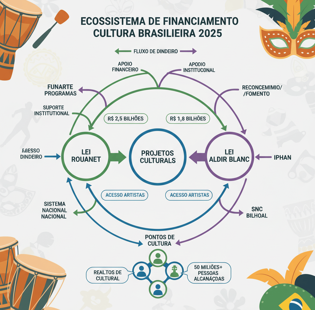 A Lei Rouanet (Lei Federal nº 8.313/1991) é o principal instrumento de financiamento cultural no Brasil. Permite que empresas e pessoas físicas deduzam investimentos em cultura do Imposto de Renda (até 4%).